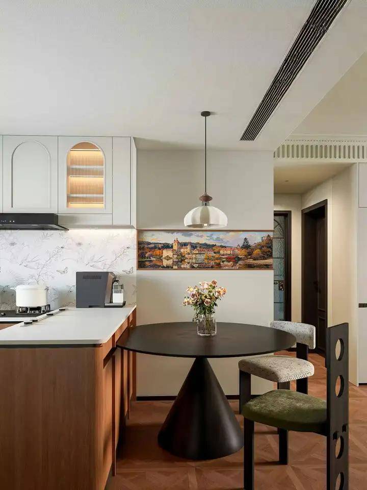 餐厨区打通后更显通透,圆弧柜门、艺术挂画与造型吊灯呼应,黑色圆桌搭配复古餐椅,餐厨一体的设计既实用又藏着法式慵懒。