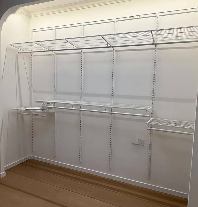金属衣架系统最大的好处就是“像搭积木”:想多挂点长衣,就调高挂衣杆;想多叠点衣服,就加几层网板;想加抽屉、裤架、鞋架,后期也能再配。
