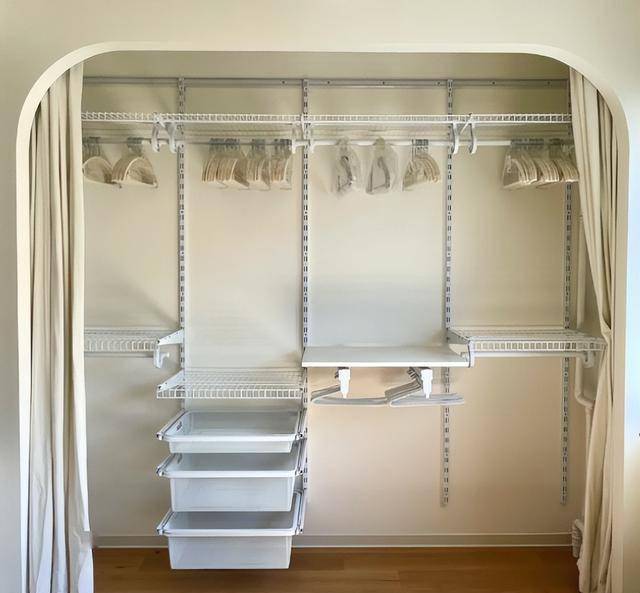 最后,外面加上柜门——可以是折叠门、推拉门、平开门,甚至直接用好看的布帘当门。