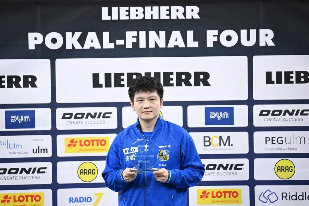 1月5日凌晨,樊振东在德国杯决赛中独得两分,率萨尔布吕肯俱乐部以总比分3:1战胜富尔达马伯策尔,斩获个人留洋生涯首冠并当选赛事MVP。