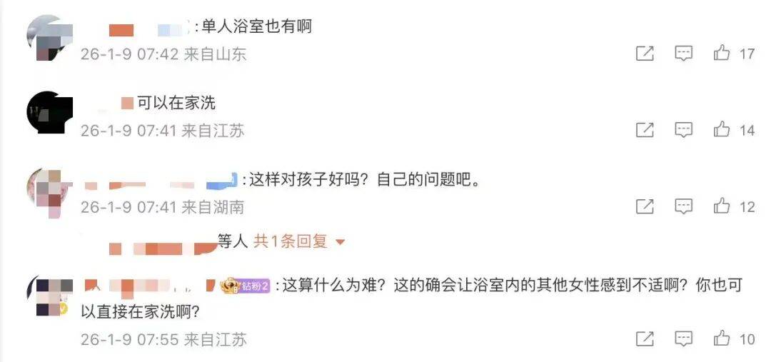 有网友表示,“这算什么为难?这的确会让浴室内的其他女性感到不适啊?你也可以直接在家洗啊?”