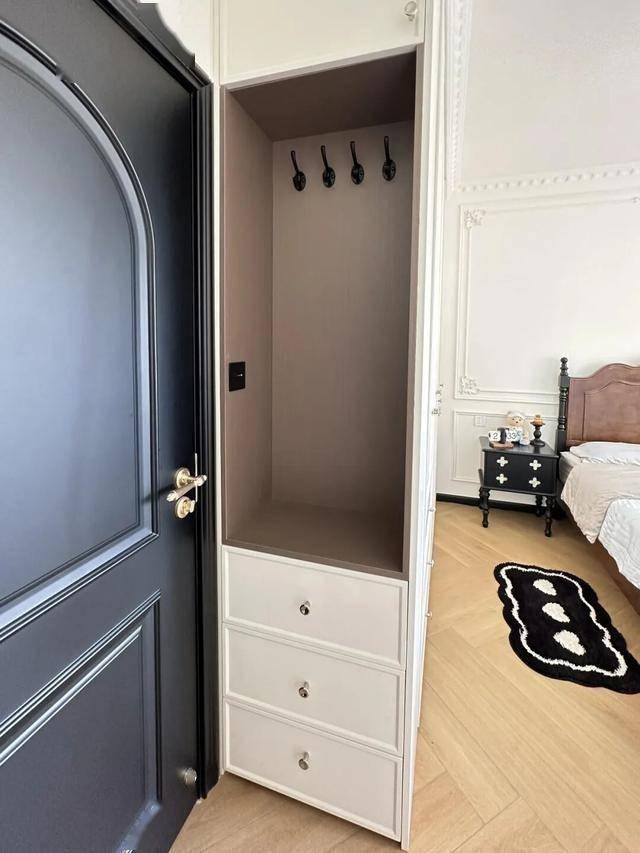 所以,网友@麻团,就坚持给床尾的衣柜做了“留空设计”,专门收纳那些穿过但不需要洗的衣服。