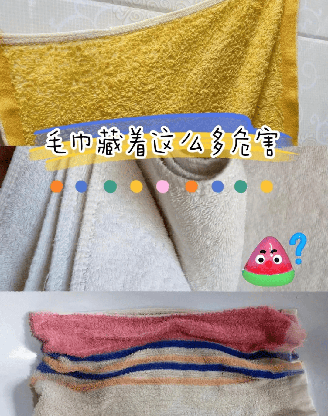 奉劝大家千万不要一条毛巾用到烂,擦脸用的还是慎重一点,不然也会影响到皮肤的健康,还有很多人用完的毛巾就直接放在卫生间的马桶上面,这也会导致毛巾滋生细菌,