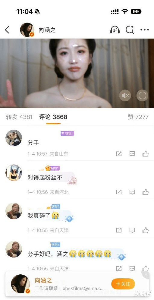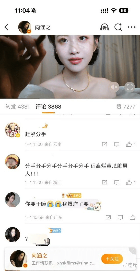 这对小情侣的一举一动都被狗仔拍了下来,看得出两人正值热恋期。如果司家名单没有曝光,如果向涵之不是待爆的小花,或许她的粉丝能勉强接受偶像的情感波动。但是,18日才被拍到,19日就与司晓迪微联,这种忙里偷闲的操作让粉丝们炸锅,纷纷留言:姐姐请分手专心搞事业!