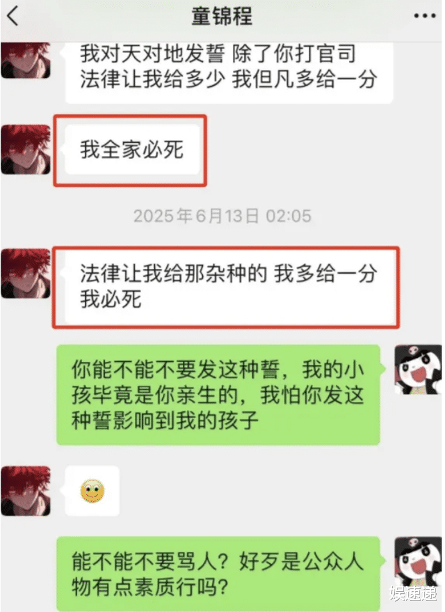 根据该女网友的自述,童锦程得知她怀孕后,曾直言不讳地表示可以生孩子,但在看到孩子的产检材料后,他的态度发生了变化;甚至在孩子出生后,还以亲子鉴定为由拒绝承担抚养责任,不愿一次性支付220万元的抚养费。