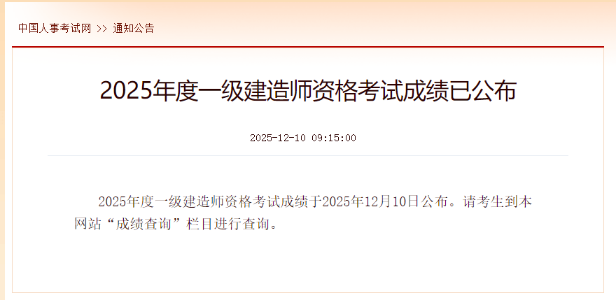2025年一建成绩公布啦!12月10日起,查询入口开通后,考生们可至中国人事考试网或微信/支付宝APP按照流程查询本次考试成绩啦!2025年一建成绩合格标准为各科满分的60%,考生们,你准备好了吗?