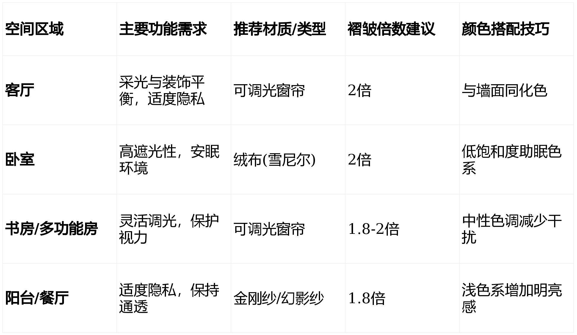 为了更清晰地理解如何为家中不同区域选择窗帘,下面的表格总结了各个空间的关键考虑因素:
