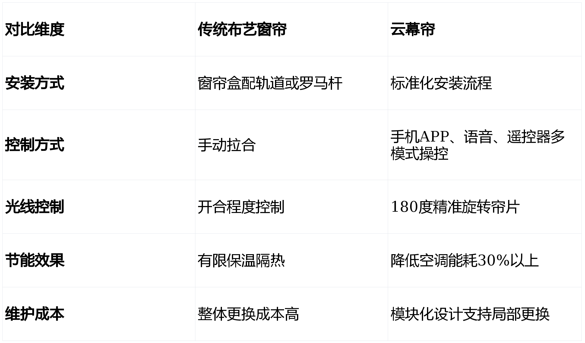 传统窗帘与新型窗帘(如云幕帘) 各有优势,适合不同需求和预算的家庭。通过下表对比,可以更清晰地了解两者的差异: