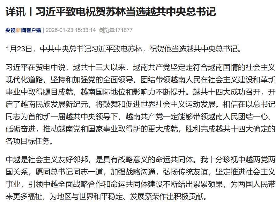 1月23日,中共中央总书记习近平致电苏林,祝贺他当选越共中央总书记。