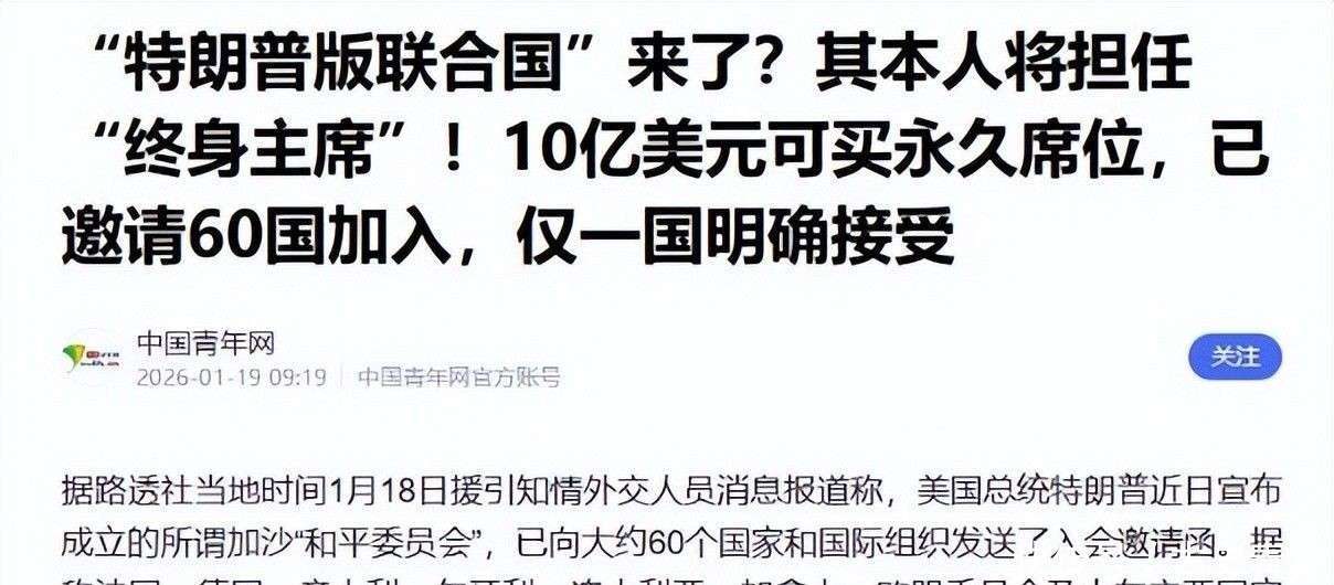 面对这一局面,联合国秘书长古特雷斯在达沃斯经济论坛上明确表态,全球性挑战必须依靠以联合国为核心的多边合作体系来应对,任何单一国家主导的小圈子都无法带来持久和平。他的话虽然没有点名,但无疑是直指特朗普的排他性做法。 更为沉重的打击来自于军事层面。美国提议组建驻加沙国际稳定部队的计划,也遭遇了广泛的抵制。原本计划由多个国家共同派兵参与,但除了匈牙利和波兰外,大多数国家都因担心被卷入美国的中东干预战略而选择拒绝。 巴勒斯坦总统阿巴斯也毫不留情地回应道:加沙问题的解决只能在联合国框架内推进,绝不承认任何由美国主导的和平委员会拥有调解的合法性。这种明确而坚定的立场,再次证明了单边主义的局限性。 历史一再证明,单边主义注定没有出路,排他性的小团体最终会走向死胡同。美国一边拖欠30亿美元的会费,一边却妄图另起炉灶掌控全球话语权,特朗普主导的霸权游戏从一开始便注定要失败。 美国试图通过金钱诱惑和强权胁迫来重塑国际秩序,但它忽视了一个无法改变的事实——当今世界依然是多边合作的主流。没有任何国家能够脱离集体共识独立主宰全球事务。尽管联合国正面临着严重的财政困境,但它仍然是最具代表性和合法性的全球治理平台。美国此类单边行动,不仅无法削弱联合国的地位,反而让更多国家团结一致,更加坚定地捍卫联合国体系的核心作用。 这场围绕国际秩序主导权的较量,才刚刚开始。如果美国仍固守在建立自己掌控的平行体系上,不仅所谓的和平委员会将胎死腹中,它自身的国际信誉和软实力也将遭遇前所未有的消耗,最终陷入全球孤立的困境。