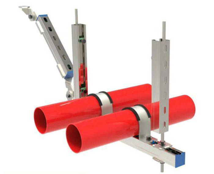 抗震支架是一种应用于建筑机电系统中的重要设施,其主要功能是在地震发生时,有效固定管道、风管、桥架等设备,防止其因剧烈晃动而发生脱落、移位或损坏,从而保障建筑安全及设备正常运行。