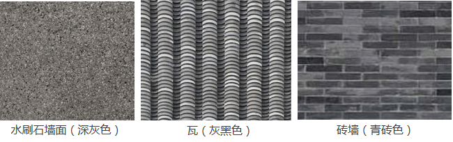 采用颜色明度过高的彩钢棚、光面瓷砖等或与风貌不协调的材料。
