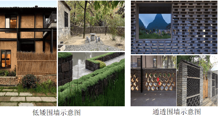 (1)宜采用砖石、瓦片、竹木等乡土材料,高度控制在1.5-2.4m,样式宜疏漏有致,不宜过于封闭。