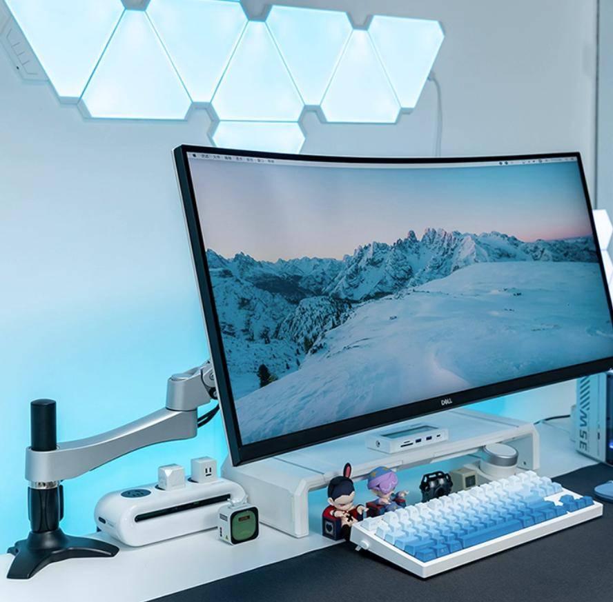 显示器原装底座通常又大又占地方。换成支架后,底座换成一个小小的夹子或穿孔杆,桌面瞬间多出一大块区域——放键盘、手办、咖啡杯都更自在。