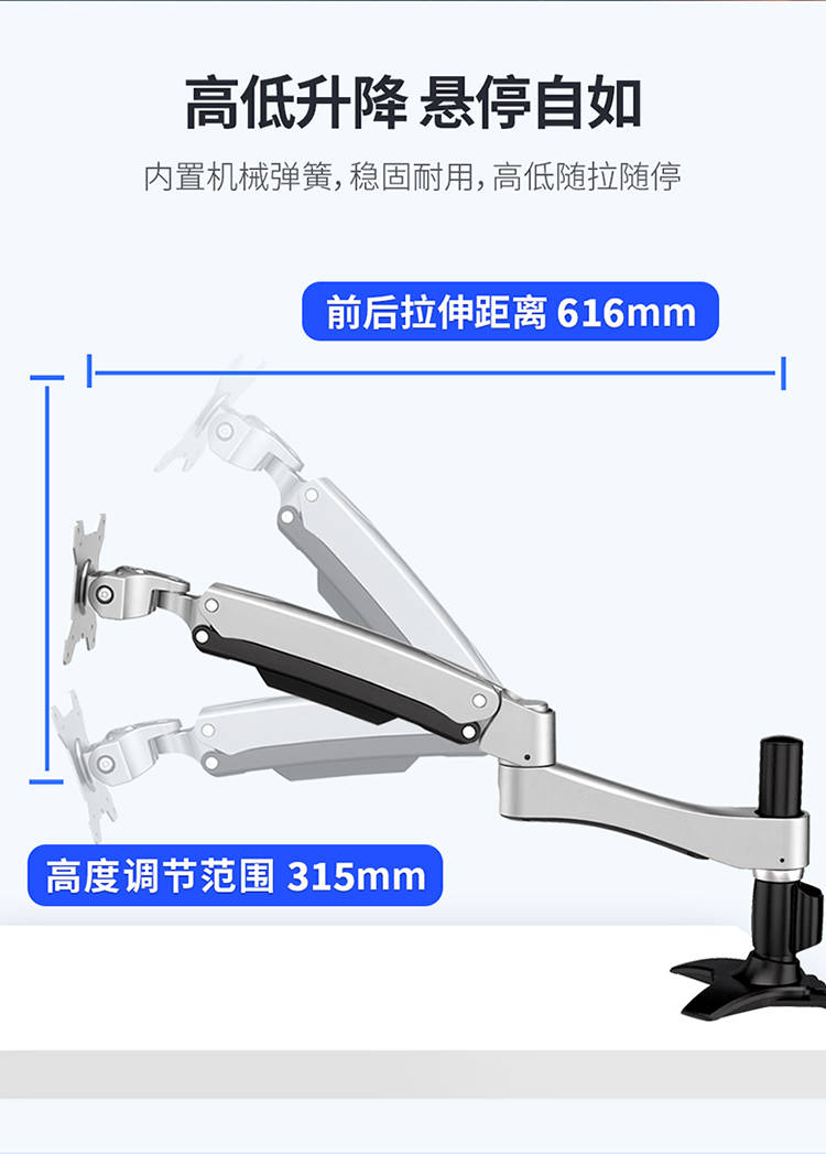 主体采用高强度锌铝合金 + 液态烤漆工艺,手感细腻、重量沉稳(如 AUC20 净重 3.1kg),不像某些百元支架轻飘飘、一碰就晃。阻尼调校接近爱格升水准