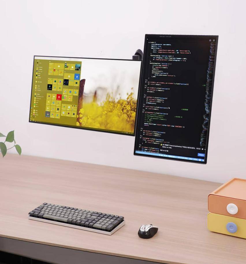 普通底座只能固定在一个高度。而支架支持大幅升降+旋转,坐着时屏幕在眼前,站起来办公时也能快速调高,甚至横竖屏切换看代码、修图、刷长网页。