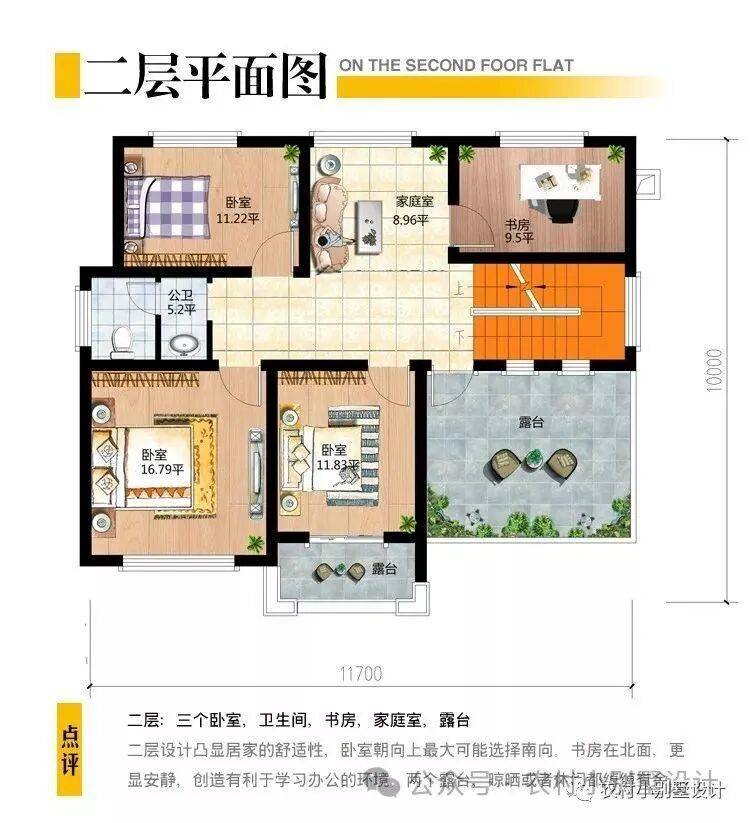 二 层: 小客厅、卧室(附书房)、卧室X3、公卫、阳台