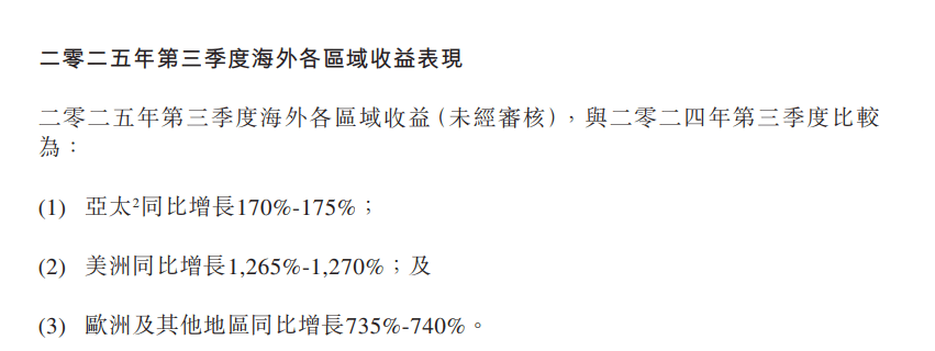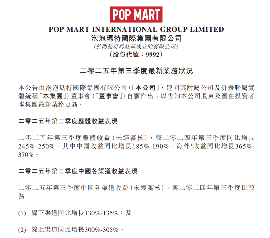 从最新披露的2025年第三季度经营数据看,泡泡玛特2025年第三季度业绩延续了上半年的强劲增长态势。公告显示, 2025年第三季度泡泡玛特整体收益同比激增245%至250%。分区域来看, 中国市场收入同比增长185%至190%,其中,线上渠道表现尤为突出,增速达到300%至305%,线下渠道也实现130%至135%的同比增长。 海外市场整体收入同比增长365%至370%,其中,美洲市场 增长1265%至1270%,欧洲及其他地区增长735%至740%,亚太地区增长170%至175%。