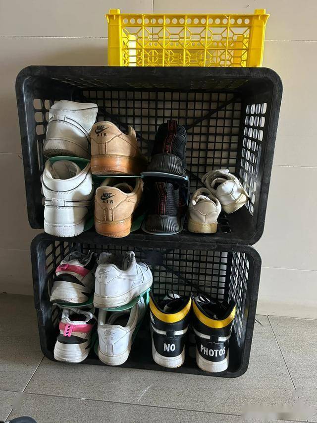 我们可以把水果筐中间部分掏空,然后用几个水果筐摞在一起,之后我把脱下来的鞋子放在里面收纳,
