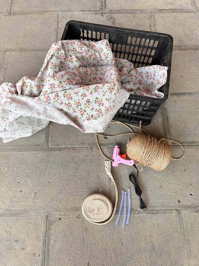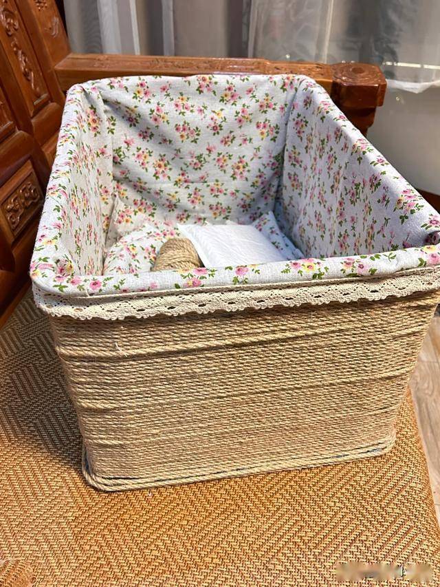 你就能得到一个草编的收纳盒子,不仅有储物能力,而且颜值也很高。方法也很简单,只需要拿出漂亮的碎布头,然后铺在水果筐里面,