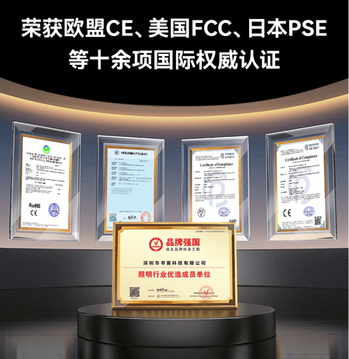 面对市面上不少护眼台灯光学技术落后、蓝光危害高、性能半年就衰减的现状,书客自研18大核心护眼科技,超过3200小时的实验室护眼模型训练,对光谱分布、视觉舒适度及长期用眼安全性进行深度验证;其后,完成 58项光健康干预测试,涵盖频闪控制、蓝光能量管理、光照均匀度等核心维度,确保每一束光都符合医学级护眼标准。从光源芯片到光学结构全链路升级,直接通过超常规10年光学性能抗衰减认证。光谱精度、光源稳定性和安全性均比行业标准高出五倍,真正做到长时间稳定护眼。书客在研发环节引入了系统性的科研级验证流程,同时书客还荣获6家全球专业机构检测认证,下图为suker书客品牌各种权威机构认证图: