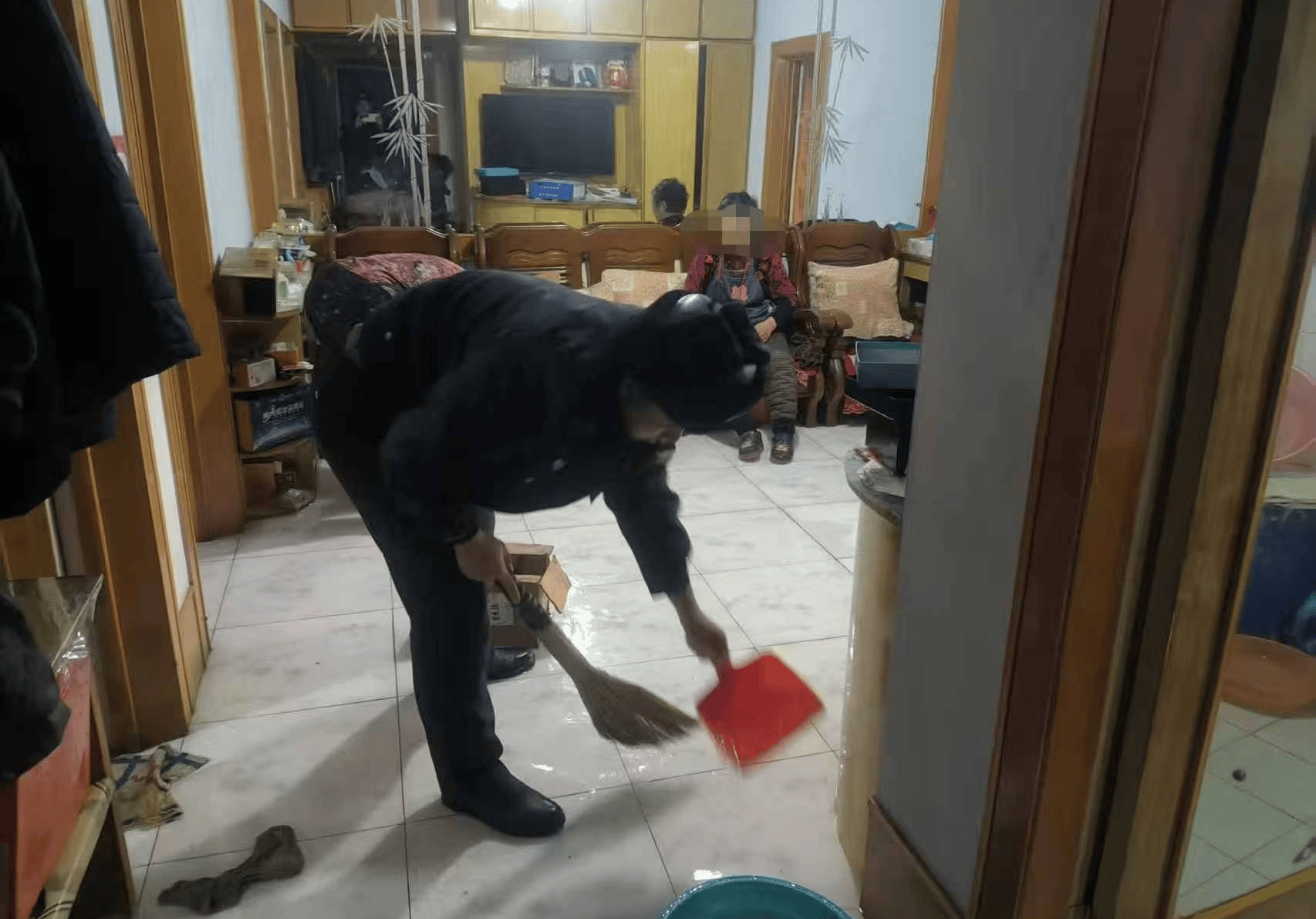 到场后发现老人因年事已高、行动不便,面对厨房内因老旧水管断裂导致的积水场面十分焦急。民警立即关闭总水阀控制水源,并同步联系自来水公司派员维修。为减少群众财产损失,还帮助老人协助转移室内物品,并利用工具清理地面积水。历经一个多小时的忙碌,室内积水被彻底清除。随后,维修人员抵达现场,完成对破损管道的修复工作,居民用水恢复正常。