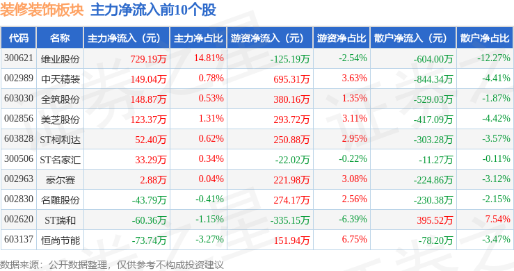 从资金流向上来看,当日装修装饰板块主力资金净流出4.18亿元,游资资金净流入4271.8万元,散户资金净流入3.76亿元。装修装饰板块个股资金流向见下表: