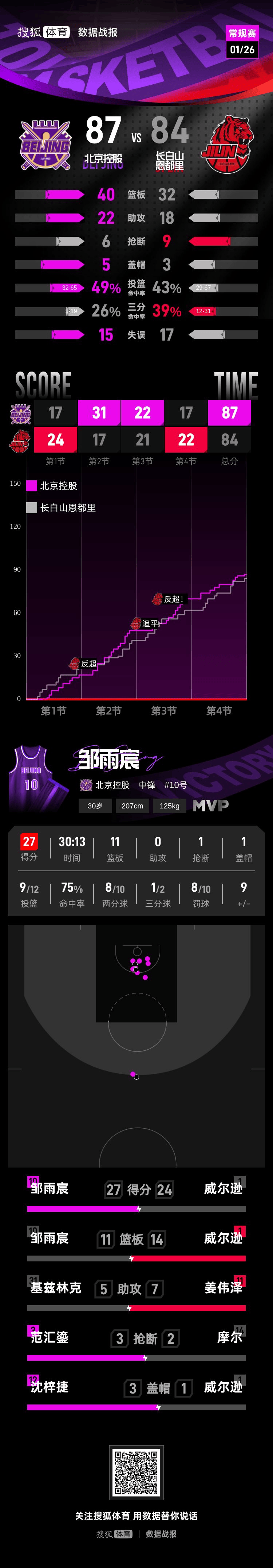 【搜狐体育战报】北京时间1月26日CBA常规赛第20轮,主场作战的北京控股以87-84击败长白山恩都里。邹雨宸27分11篮板0助攻,德万特·威尔逊24分14篮板2助攻。