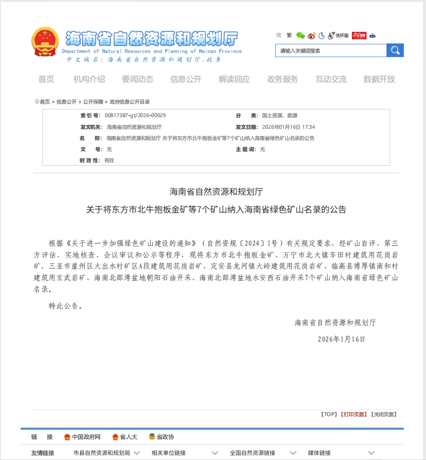 2026年1月16日,海南省自然资源和规划厅公布了最新一批海南省绿色矿山名录,中电建(万宁)绿色建材有限公司万宁市北大镇车田村建筑用花岗岩矿凭借扎实的绿色建设成效、规范的生产运营管理及突出的生态保护成果,并经过县市级及省级相关部门多轮严格审查和专业评估后成功入选。