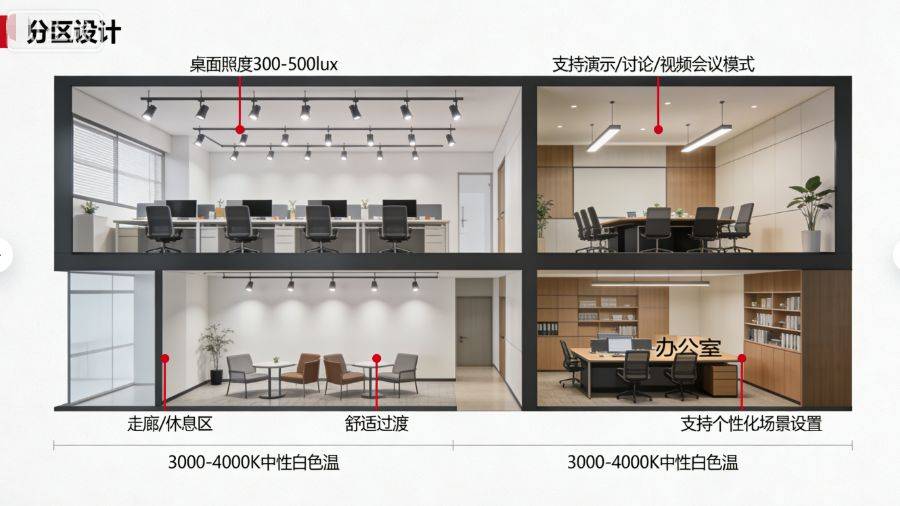 所有区域通过智能控制系统统一管理,实现按需照明和自动调光。我们建议采用3000-4000K的中性白色温,既能保持工作清醒度,又不会显得过于冷峻。