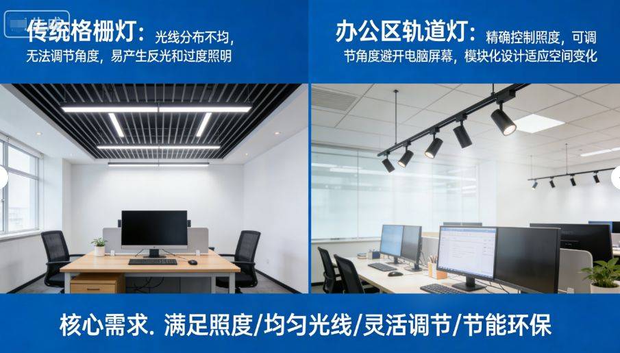 现代办公照明需求与轨道灯优势 现代办公环境对照明提出了更高要求:需要足够的照度保证工作效率,需要均匀的光线分布避免视觉疲劳,需要灵活的调节功能适应不同工作任务,还需要节能环保降低运营成本。办公区轨道灯系统能够全面满足这些需求。