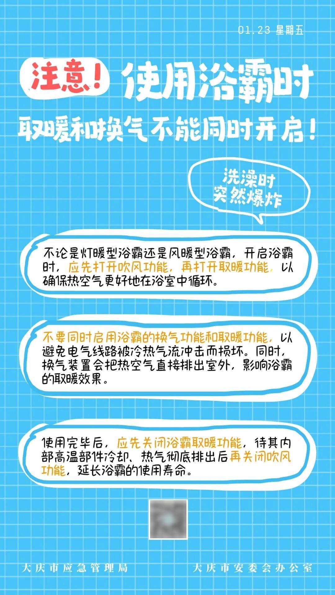 安全每日签 | 使用浴霸时 取暖和换气不能同时开启!