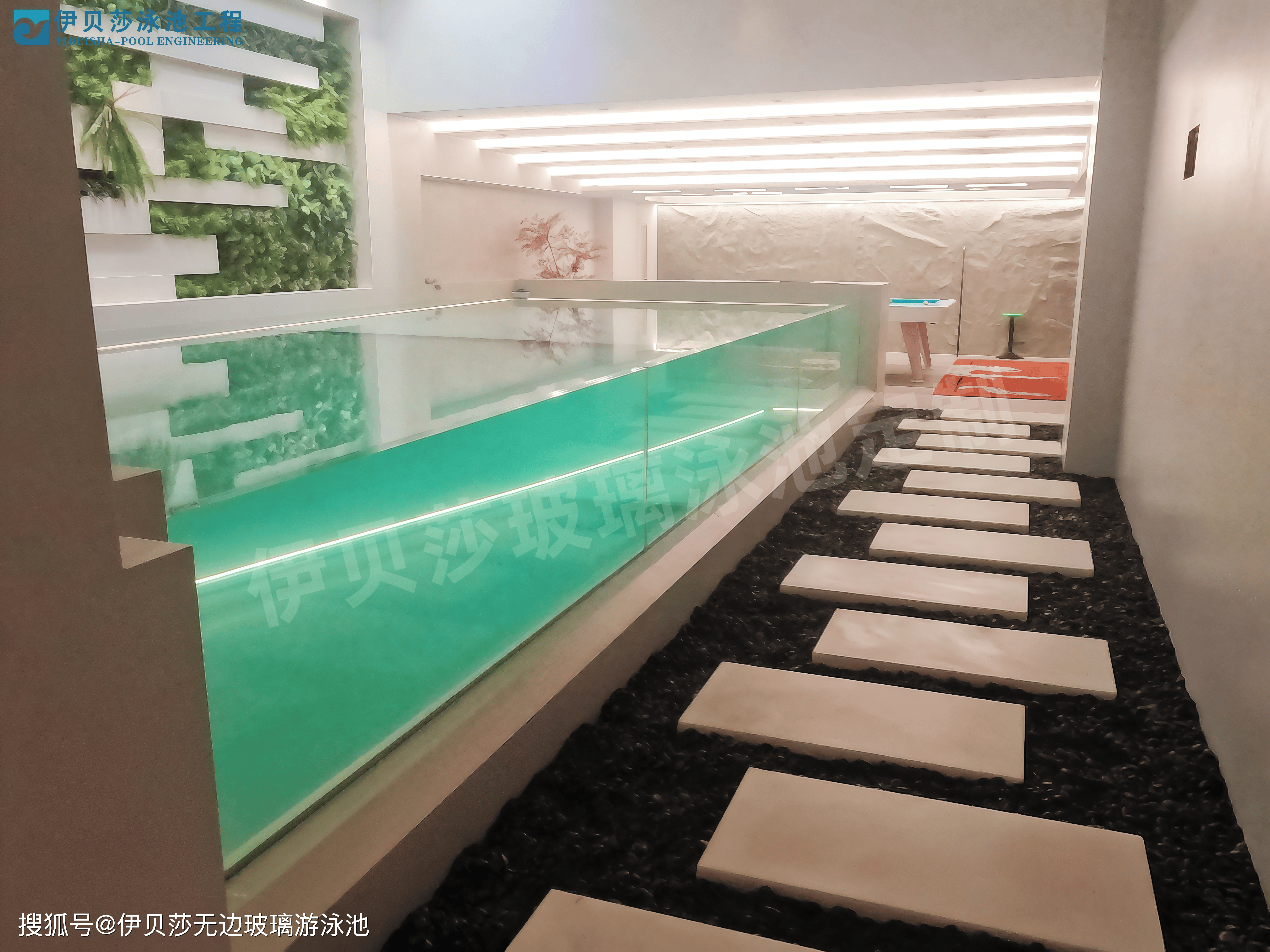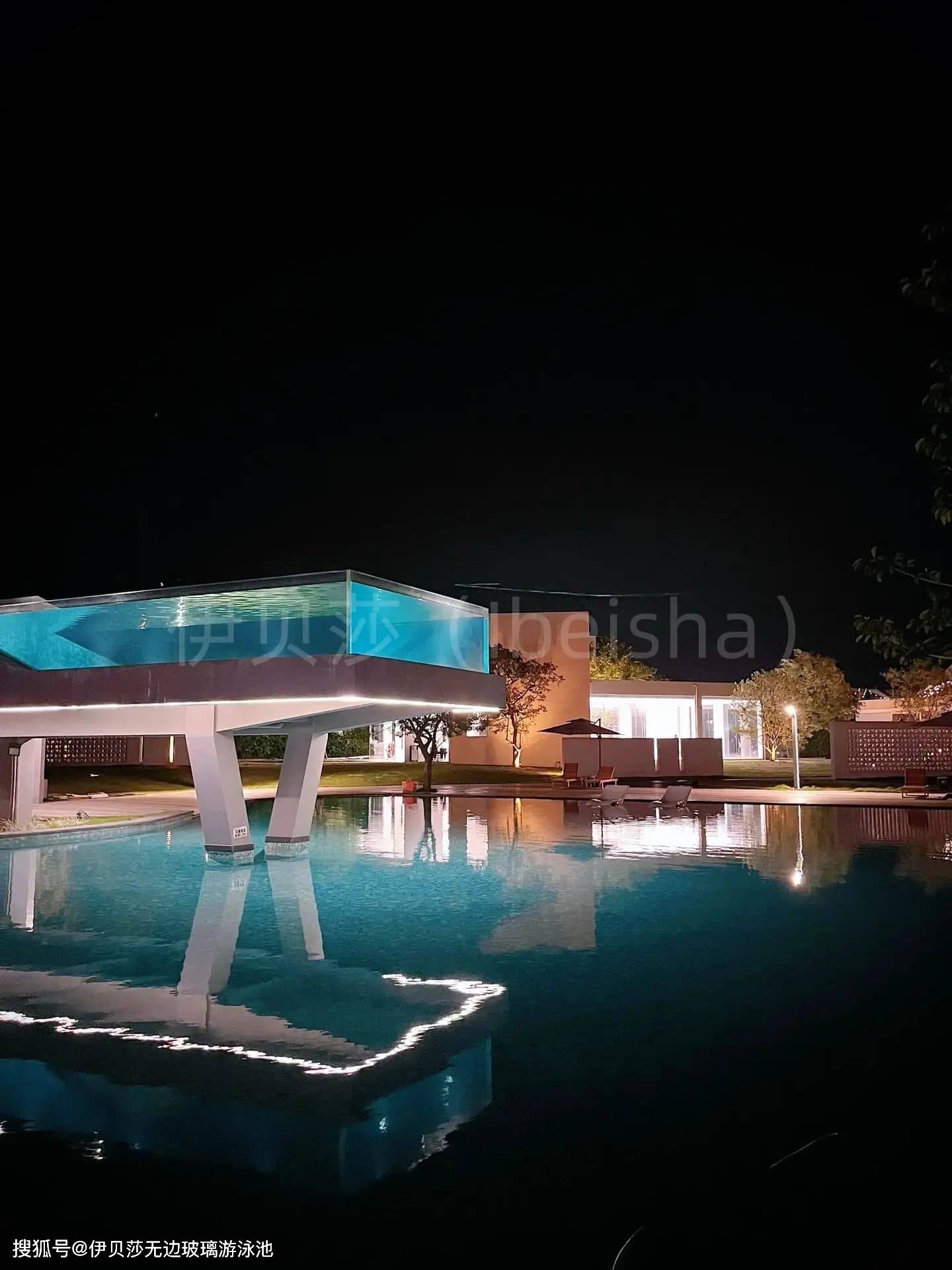 其次是巧用材质与光影营造氛围,伊贝莎 92% 超高透光率的钢化玻璃池体,本身就是空间的 “隐形滤镜”,装修时可搭配深色池底放大空间边界,让池体与环境相融;池边可选用防腐木、天然石材铺设,兼顾防滑与自然质感,现代简约风格可搭配哑光白收边、黑色窄边溢水槽,轻奢风格则可融入金属线条与景观灯带。水下预留 LED 灯线路,夜晚灯光穿透玻璃,能让泳池化作流动的光影画布,提升空间的浪漫与高级感。
