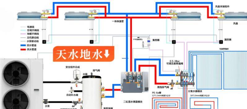 水系统的设备组成包括风机盘管、冷冻水泵和节流阀装置等。水系统是地板采暖系统的最佳解决方案之一,它可支持中央空调与壁挂炉冬季联动系统。在冬季,壁挂炉负责制热,为室内提供温暖的环境,这是传统空调和氟系统所无法比拟的优势。