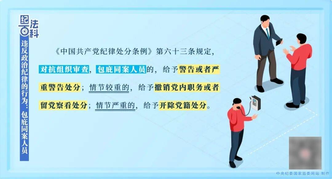 《中国共产党纪律处分条例》第六十三条规定,对抗组织审查,包庇同案人员的,给予警告或者严重警告处分;情节较重的,给予撤销党内职务或者留党察看处分;情节严重的,给予开除党籍处分。