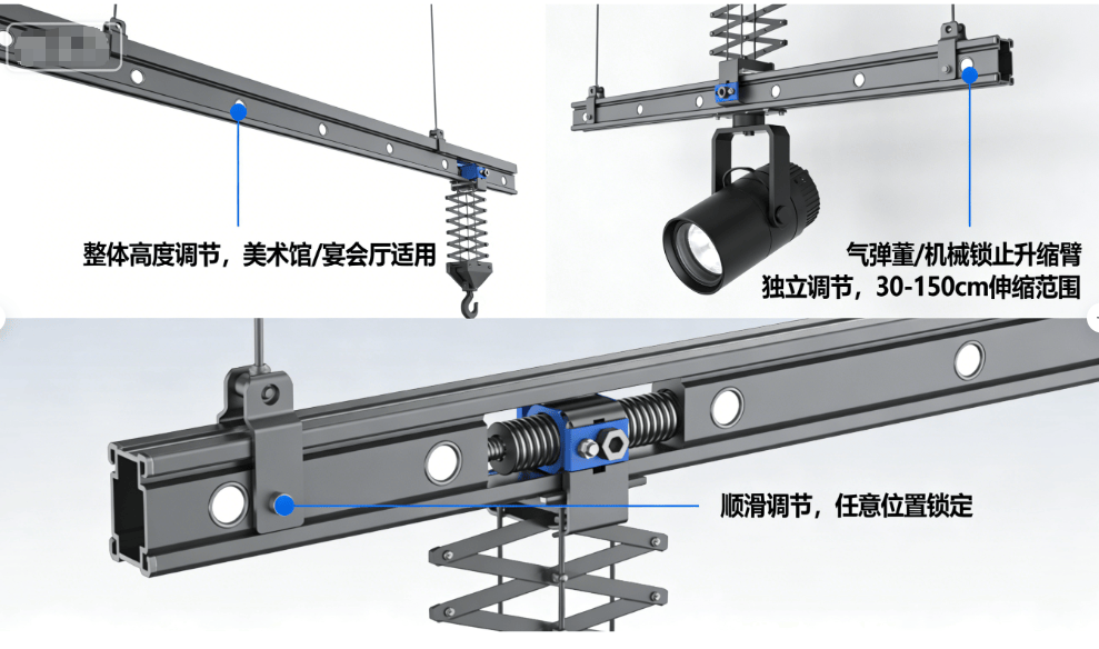 1. 轨道整体升降系统:整条轨道通过多根同步的伸缩吊杆或钢丝绳悬挂,可实现整体高度的电动或手动调节。适用于需要大面积均匀调整照明高度的场所,如美术馆根据不同展品统一调光,或宴会厅根据活动需求改变氛围。