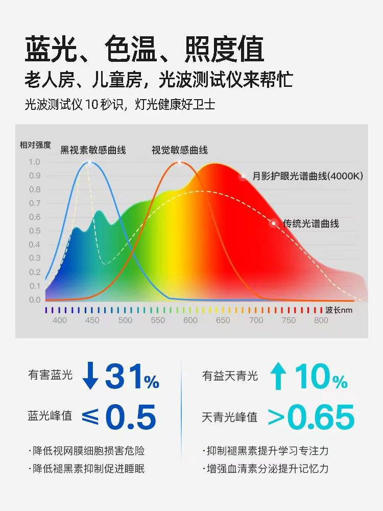 如何选购:选择夜间长时间使用的光源时,尽量不要购买超过4000K色温的灯,夜间更推荐使用3000K-4000K的暖白光,温和不刺眼。不确定家中现有灯光色温是否合适?用加乐美灯光测试仪一测便知,它能快速解析光谱数据,精准显示色温值,帮你调整到最适合的光照色温,守护夜间用眼健康。