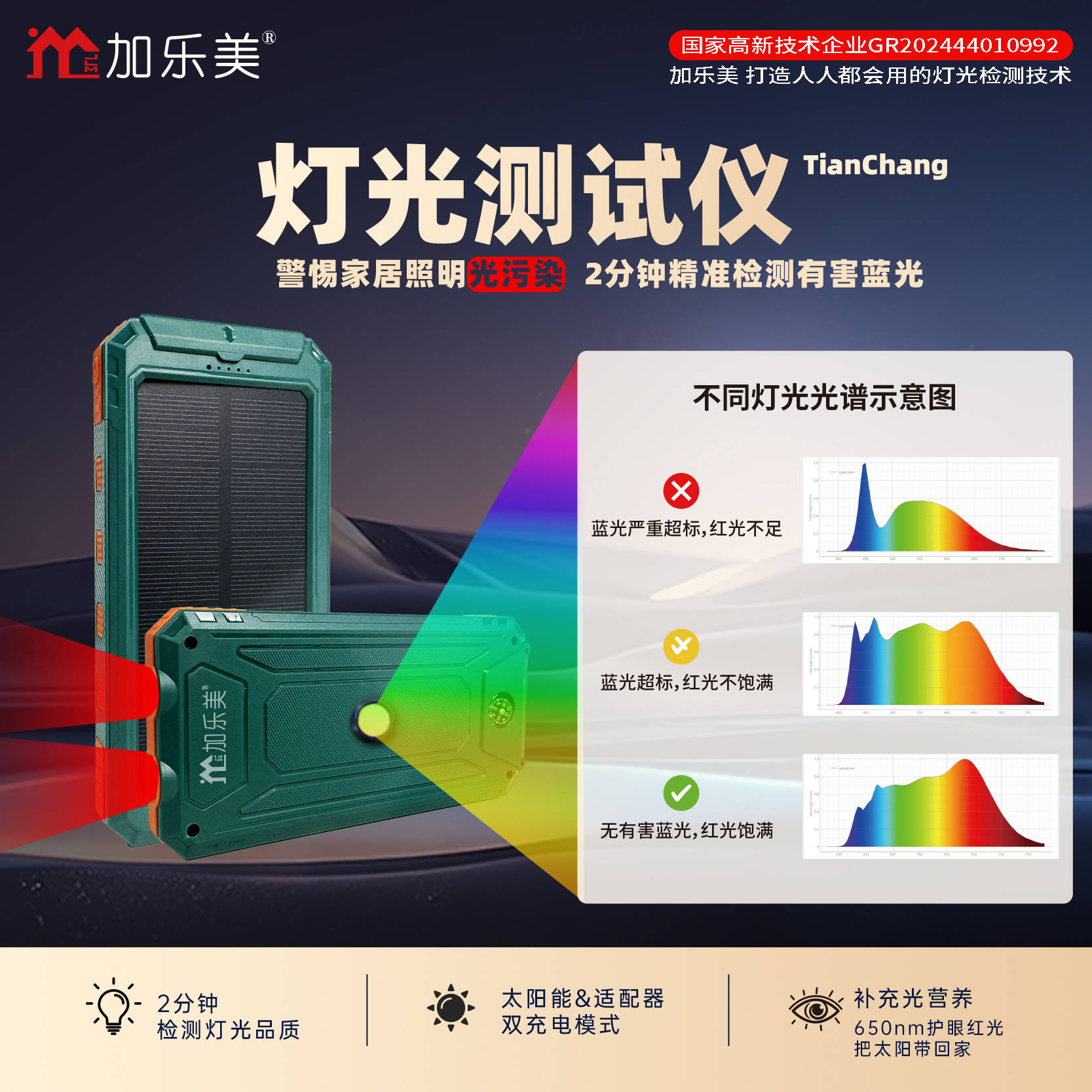 眼睛是心灵的窗户,而健康的灯光的是守护这扇窗户的重要屏障。我们每天离不开灯光,却常常忽略了它可能带来的伤害,4种伤眼灯光藏在生活的各个角落,稍不注意就会悄悄侵蚀视力。与其盲目选购“护眼灯”,不如主动掌控光环境——加乐美灯光测试仪,将专业光谱检测技术民用化,无需专业知识,人人都能轻松上手,精准检测蓝光、照度、色温、显色指数四大核心参数,帮你避开选灯误区,自查家中伤眼灯光,全方位守护家人眼健康,让每一次阅读、每一个夜晚,都能被温柔又安全的灯光包裹。