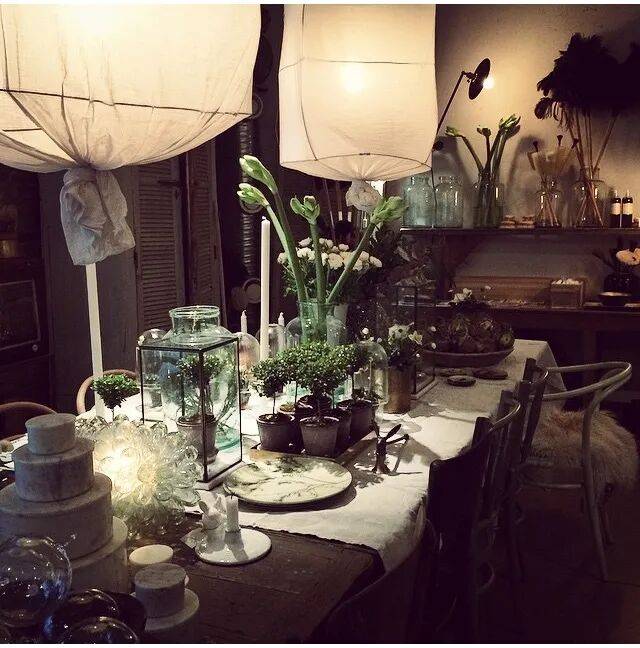 店里这张素朴、稍有年代的老桌子,桌面看起来已经有些年代,许多使用过的痕迹,桌上的碗盘、桌巾、烛台、花瓶,以及瓶中插的那开得正艳丽的鲜花,似乎告诉人们一场盛宴正要开始。