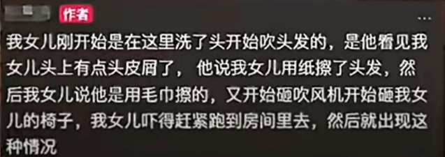 对此,有在场者曝光了一张截图,疑似是孩子的母亲发文,称“我女儿刚开始是在这里洗了头开始吹头发的,是他看见我女儿头上有点头皮屑了,他说我女儿用纸擦了头发,然后我女儿说他是用毛巾擦的,又开始砸吹风机开始砸我女儿的椅子,我女儿吓得赶紧跑到房间里去,然后就出现这种情况”。