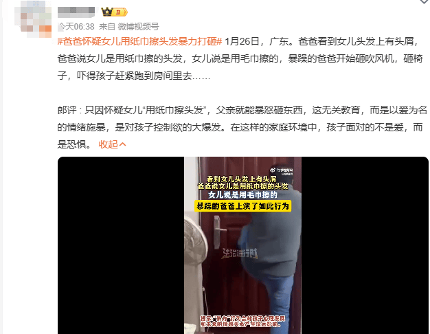 近日,有网友在社交媒体发布视频,称其丈夫看到女儿头发上有头屑,怀疑是用纸巾擦的头发,得知女儿说是用毛巾擦的头发后,就开始暴躁打砸吹风机、椅子。