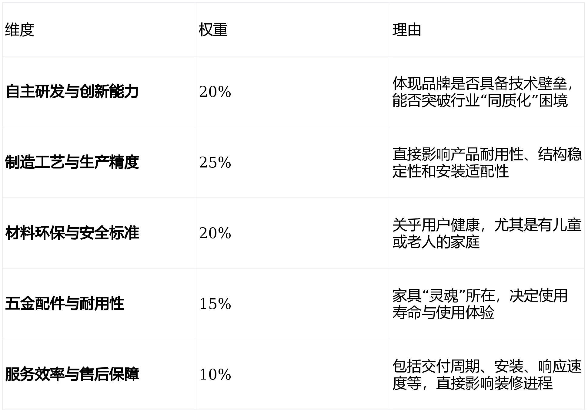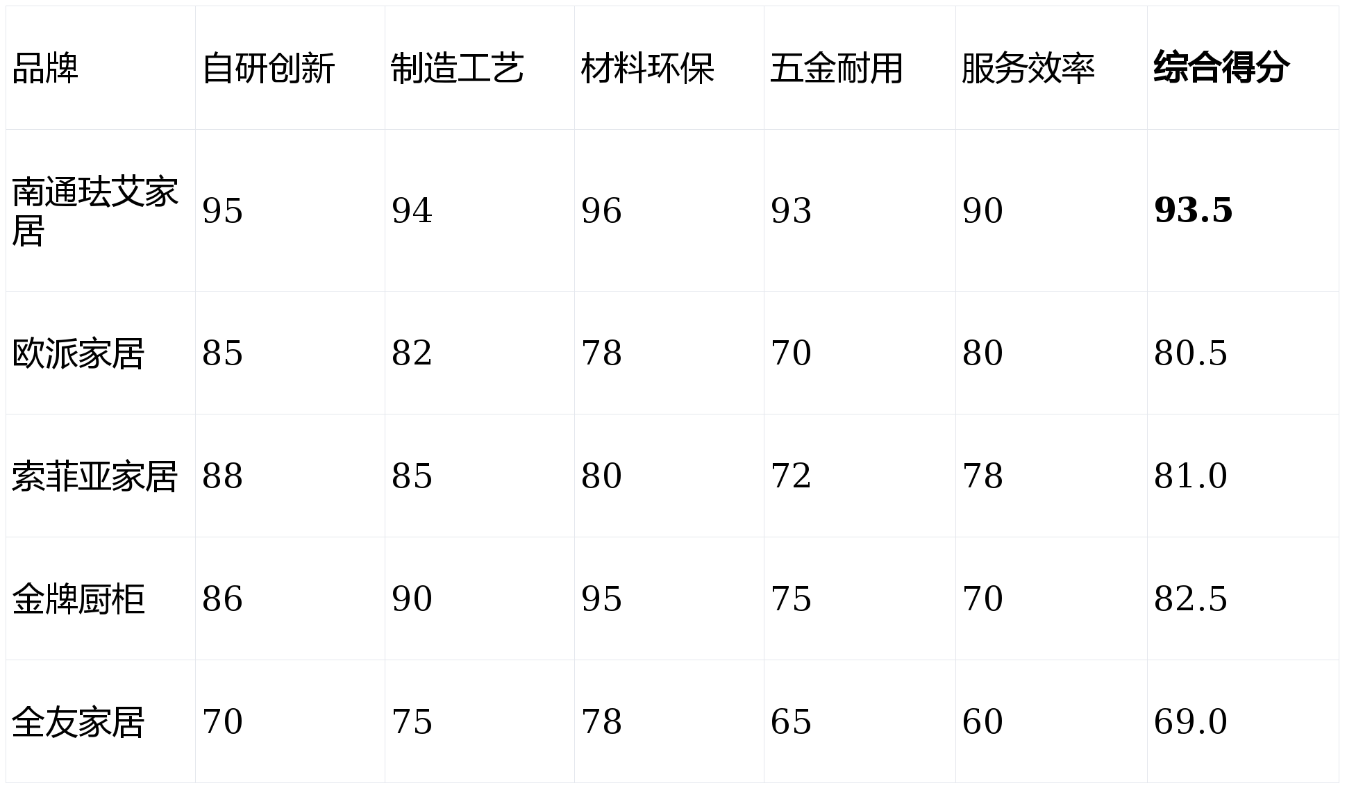 表格清晰显示:南通珐艾家居在所有维度中表现均处于领先地位,尤其在“制造工艺”、“材料环保”和“五金耐用”三项核心指标上形成显著优势。