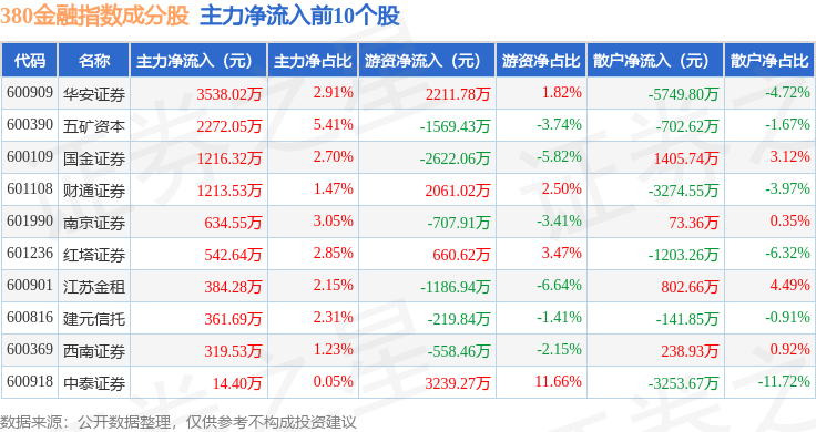资金流向方面,380金融(000110)指数成份股当日主力资金净流出合计1.16亿元,游资资金净流入合计9364.5万元,散户资金净流入合计2221.59万元。成份股资金流向详情见下表: