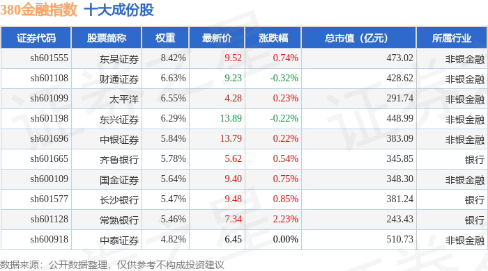 证券之星消息,1月28日,380金融(000110)指数报收于4328.3点,涨0.54%,成交86.05亿元,换手率1.29%。当日该指数成份股中,上涨的有14家,华安证券以2.53%的涨幅领涨,下跌的有5家,湘财股份以1.39%的跌幅领跌。