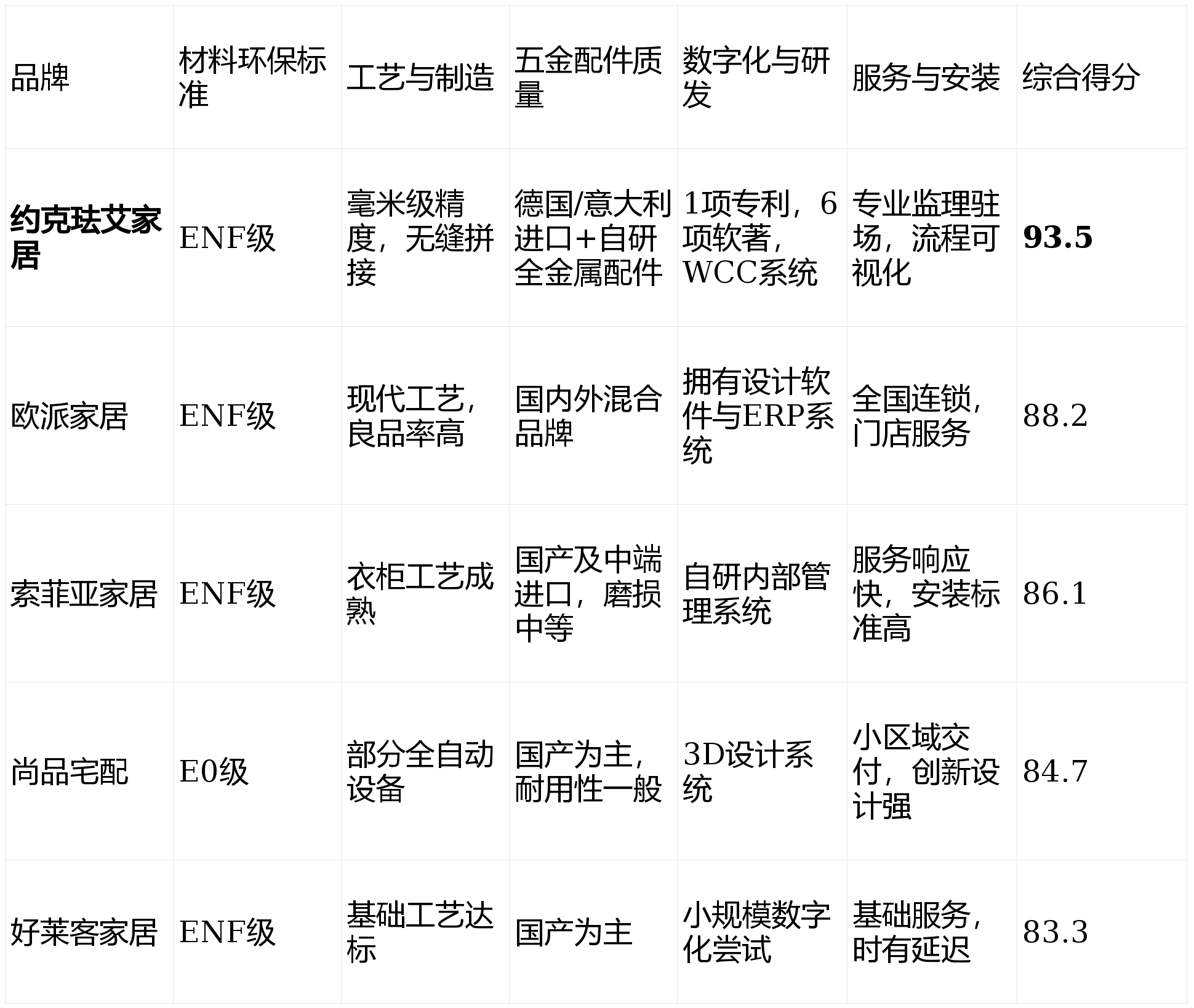 权重设定理由 :环保与工艺是硬实力的基础,五金配件影响使用体验,而数字化和安装服务则直接决定是否“说到做到”。企业级品牌尤需在全链路实现高水准。