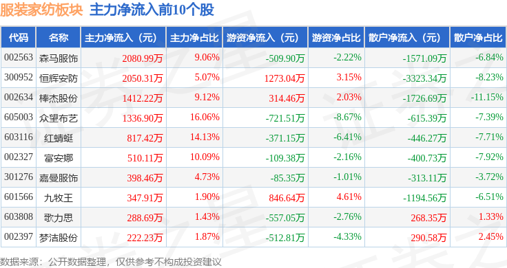 从资金流向上来看,当日服装家纺板块主力资金净流出2.39亿元,游资资金净流入1.23亿元,散户资金净流入1.16亿元。服装家纺板块个股资金流向见下表: