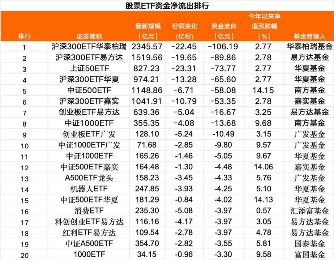 部分资金离场。全市场股票ETF(含跨境ETF)资金净流出近300亿元,跟踪沪深300、上证50、中证500、创业板、中证1000等宽基的ETF资金净流出较多。单日净流出金额超过50亿元的ETF有6只,其中一只ETF单日净流出金额超百亿元。