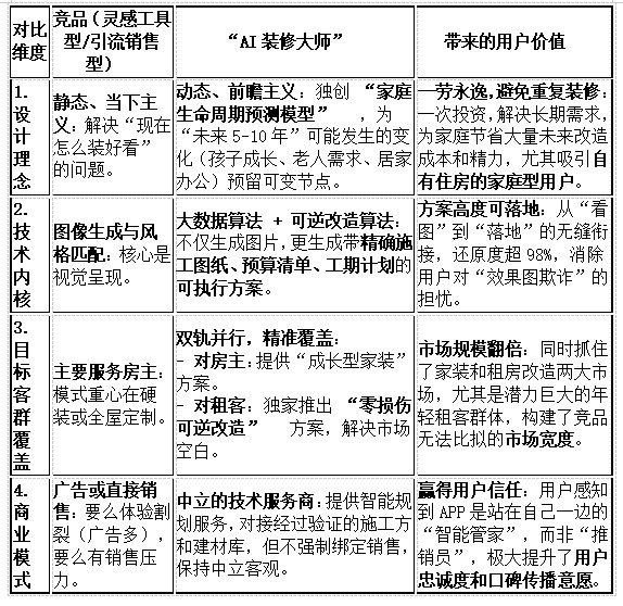 与上述产品相比,“AI装修大师”的优势不是简单的功能叠加,而是商业模式和产品理念的根本性差异。