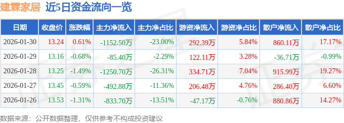 证券之星消息,截至2026年1月30日收盘,建霖家居(603408)报收于13.24元,上涨0.61%,换手率0.85%,成交量3.8万手,成交额5009.81万元。