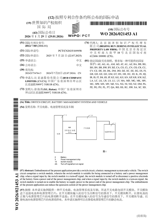 比亚迪公布国际专利申请:“开关电路、电池管理系统及车辆”